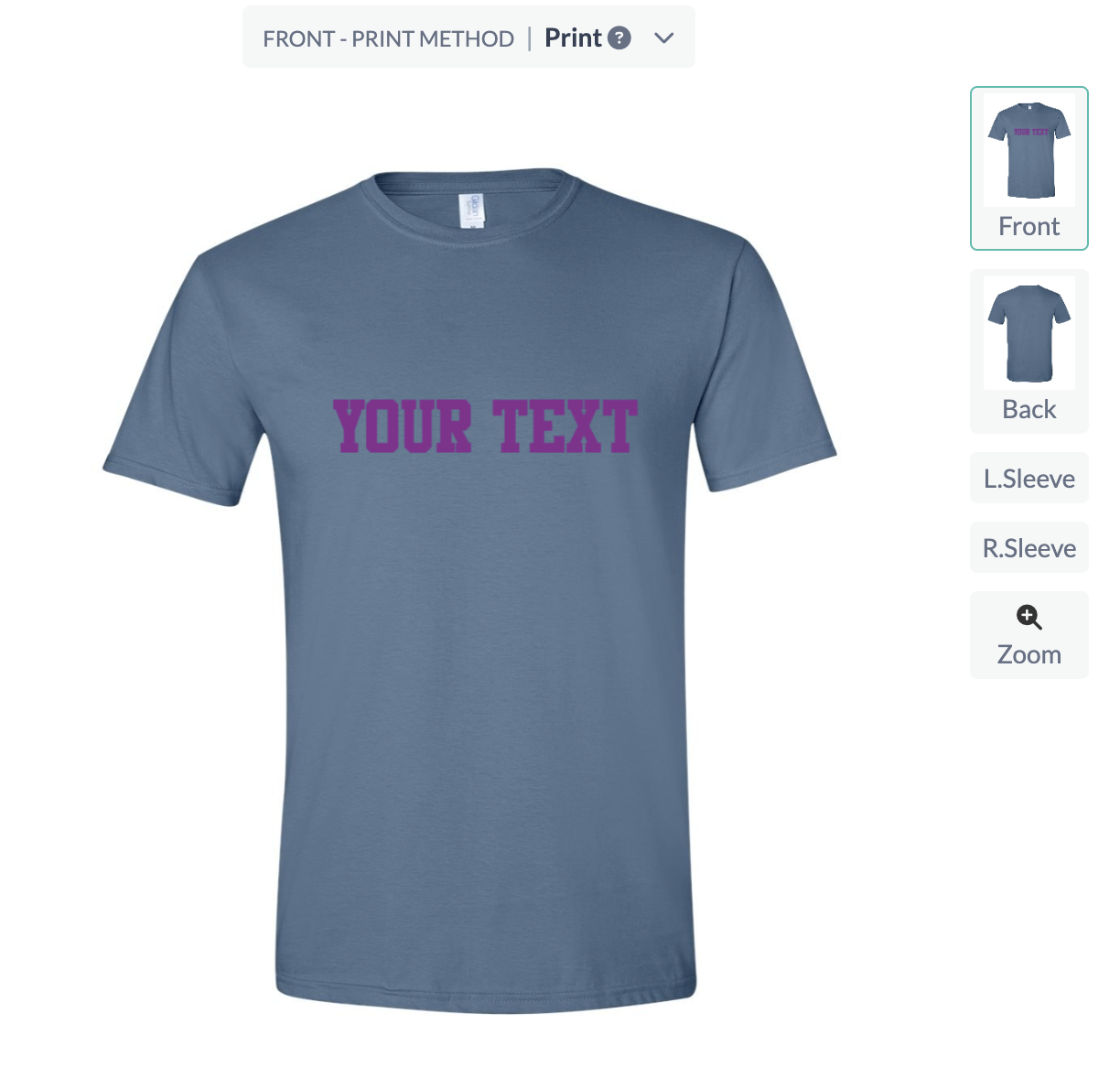 To place a design on the back, click the Back button on the upper right-hand corner of the screen. Once the back appears, you can proceed to upload an artwork file, add text, or personalization as usual.